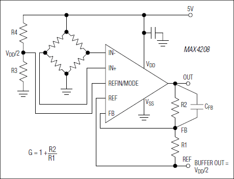 MAX4208的增益可通过两个外部电阻调节,或将FB连接至OUT配置为单位增益。MAX4209提供精度为±0.03% (典型值)的100V/V固定增益。这两款器件都带有基准输入(REF),用于建立输出偏置,允许在单电源供电时处理双极性信号。在这两款器件中,REFIN/MODE是高精度单位增益缓冲器输入,用于设置建立输出偏置的REF电压。内部REF缓冲器可通过简单的电阻分压器设置基准或使用ADC基准,没有任何负载误差。